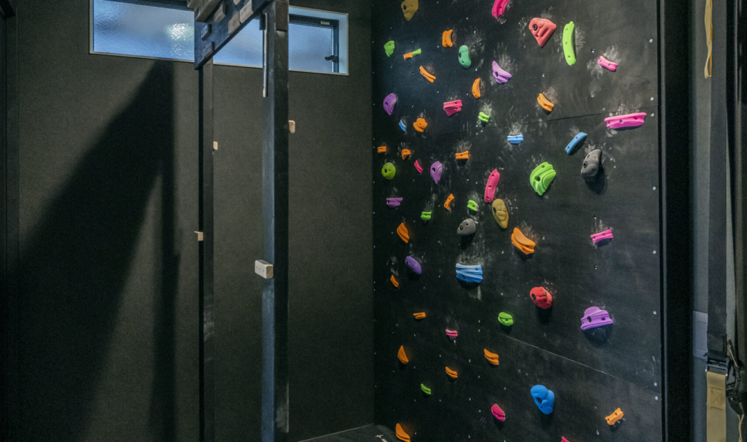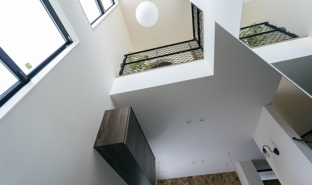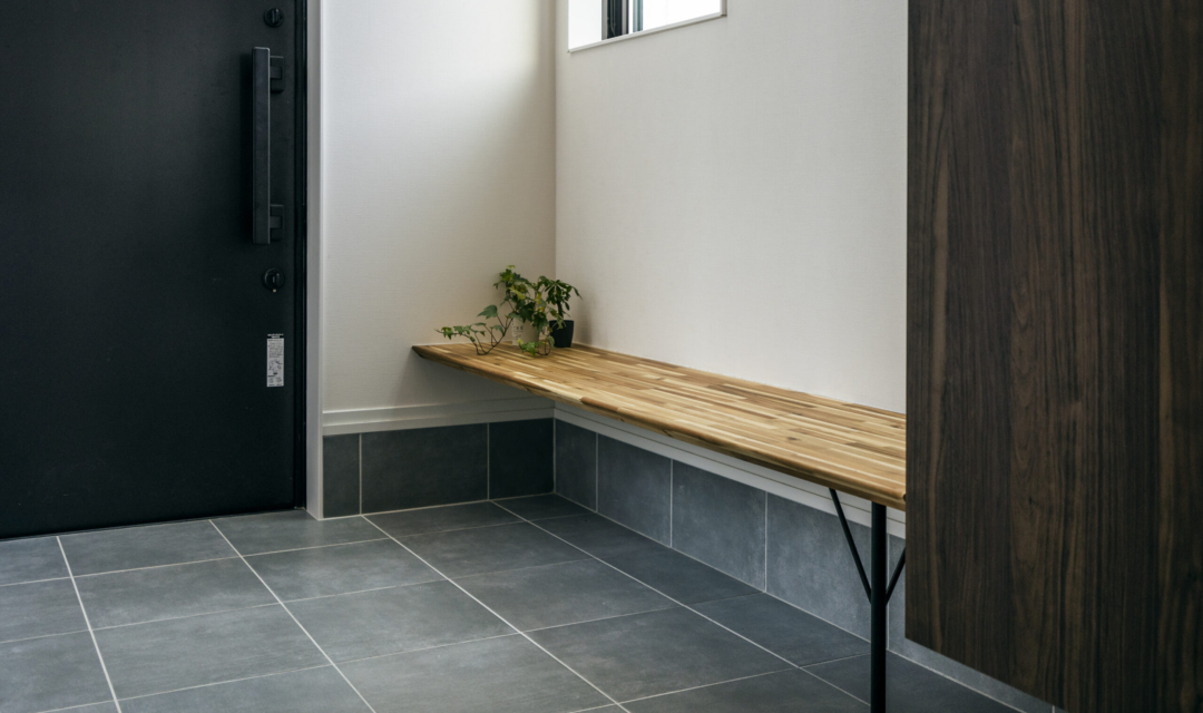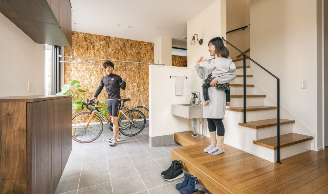 「アウトドア」や「ロードバイク」「クライミング」の趣味を持つA様。アウトドア用品を車に積み込みやすくするために玄関を駐車スペースと隣接するよう計画しました。ロードバイクの出し入れも楽に行うことができ、使わない時もかっこよく収納できるように玄関正面には“OSB合板”のアクセントウォールを。ガレージのような使い勝手をイメージしました。また、玄関土間には吹抜があり開放感の溢れる空間に。階段下収納や、ベンチも設けていて座って靴を履けたり、物を飾ったりと自由度の高い、盛り沢山な玄関土間スペースになっています。玄関土間→トレーニングルーム→お風呂に直行できる動線も確保しているので、汚れて帰ってきても家の中が汚れる心配がありません。