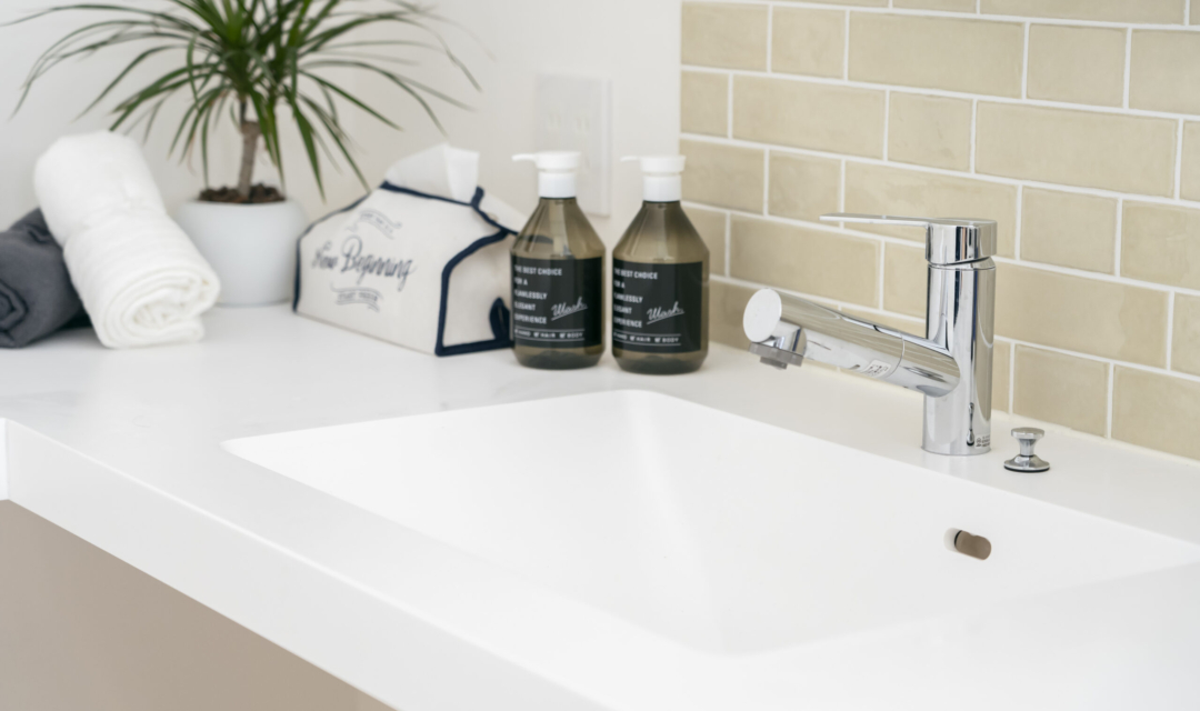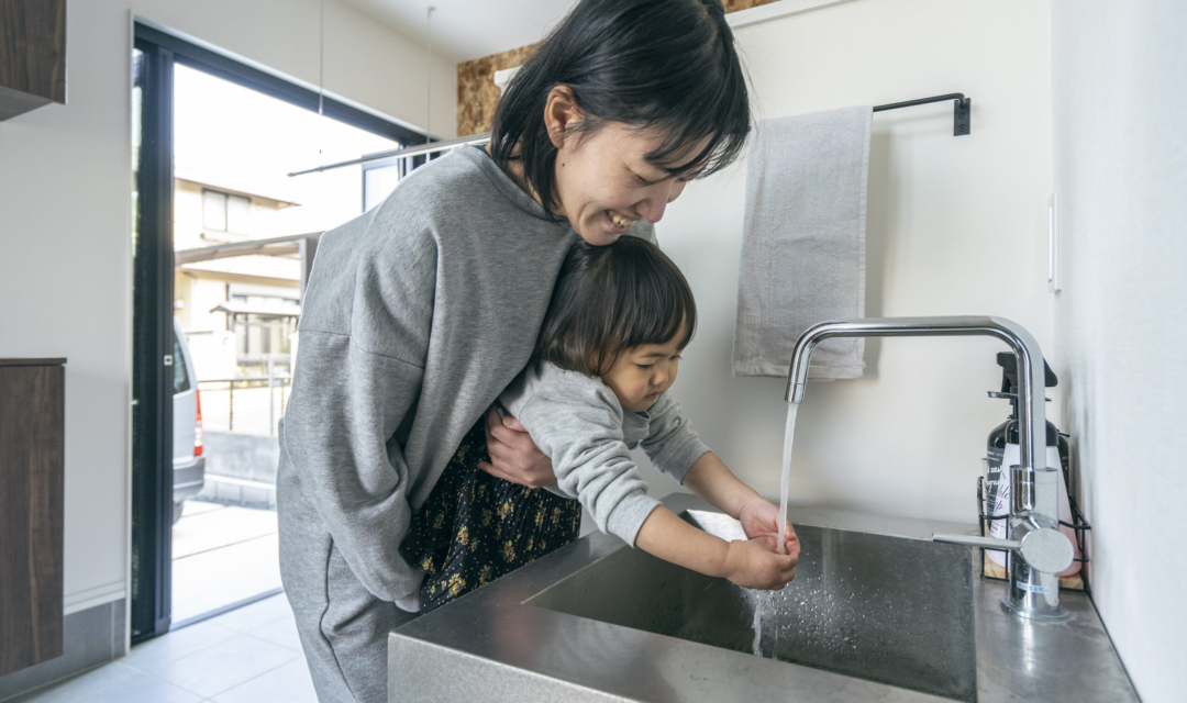 造作洗面で2ボウル、2ミラーの奥様がこだわった洗面室。朝の忙しい時間に混雑しないよう広く設計しています。外干しエリア&室内干しエリアへアクセスしやすいように計画していたり、洗濯物を取り入れアイロンがけや洗濯物をその場で畳めることができるようカウンターを設けていたり、家事が楽になる工夫もしています。実用性の面だけではなく、タイル貼りのアクセントや高所に窓も取り付けているので明るくおしゃれな空間に仕上がっています。
