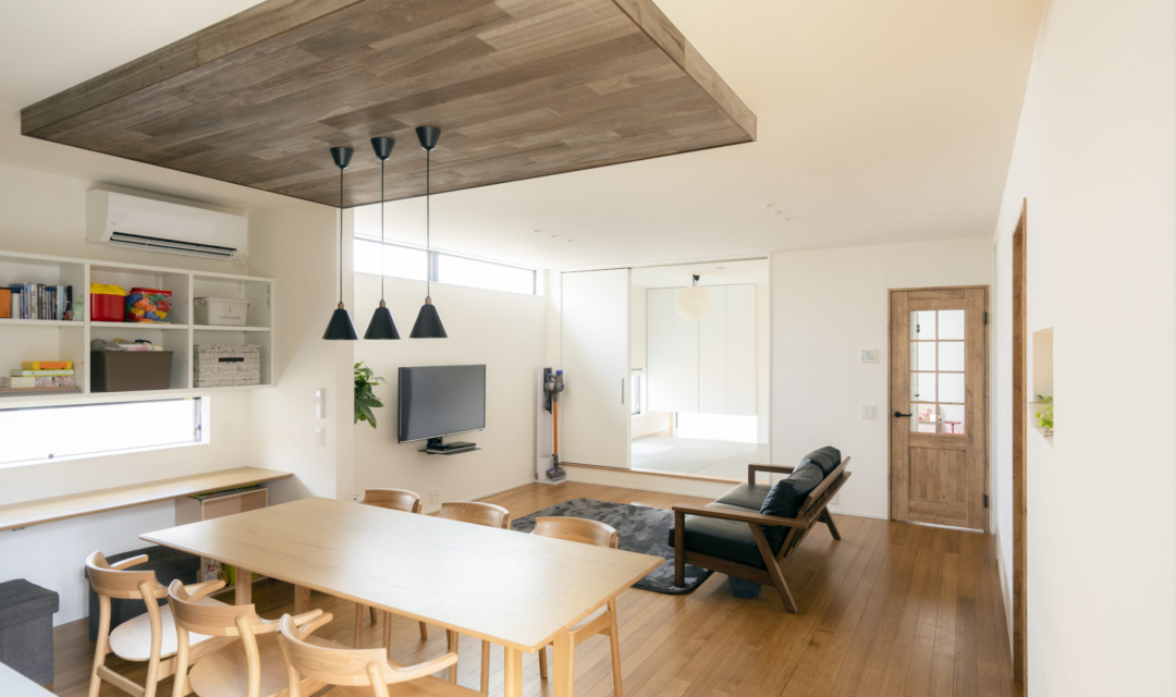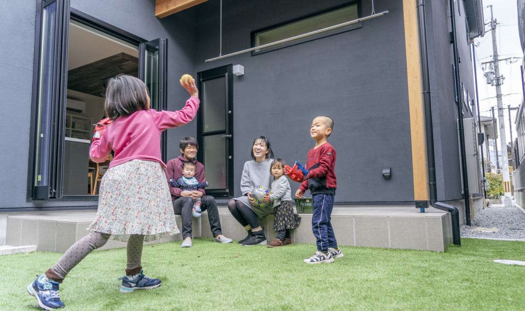 多趣味でご家族が多いA様邸の実用性抜群で工夫した空間に、A様のこだわりと遊び心のあるこだわりのお家が完成いたしました。広い玄関土間スペースには、お子様が帰宅したら真っ先に手洗いができるようミニ洗面やたくさんの収納を設けています。各個室には学習机を置かず、スタディスペースをLDK内に設け、キッチンからご家族を見渡せるようにLDK+和室を一直線にレイアウト。キッチン横にはプライベートなお庭を設けBBQや水遊びもできます。2階には、お子様専用のCLがあったり、1室から4室に間仕切れるように計画。他にもシアタールームやトレーニングルームなどお家で楽しめる空間がたくさんあるのが特徴です。主寝室には間仕切り壁を利用した壁一面の漫画スペースも。外観には4面ジョリパットを採用し、木のアクセントウォールも2面使用しています。動線や収納など、家事を楽しく楽になるよう設計しました。