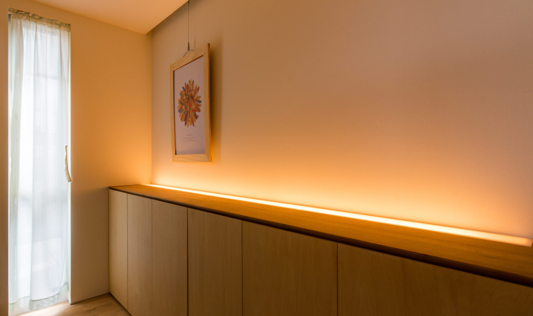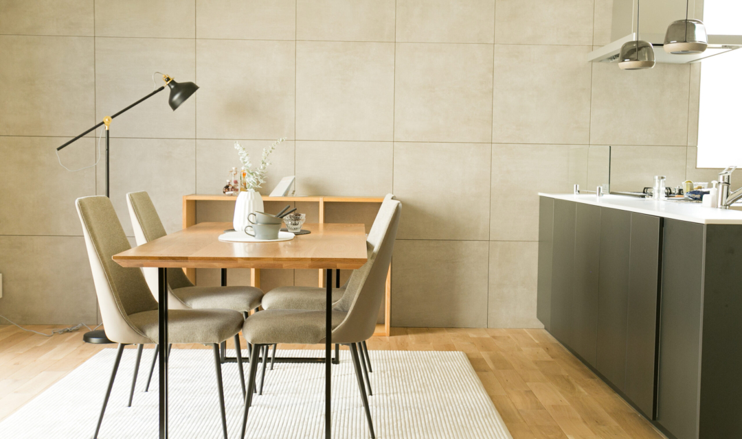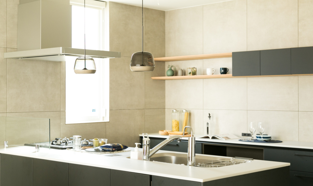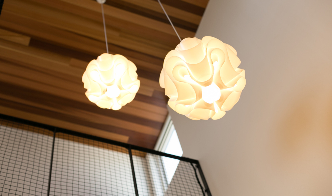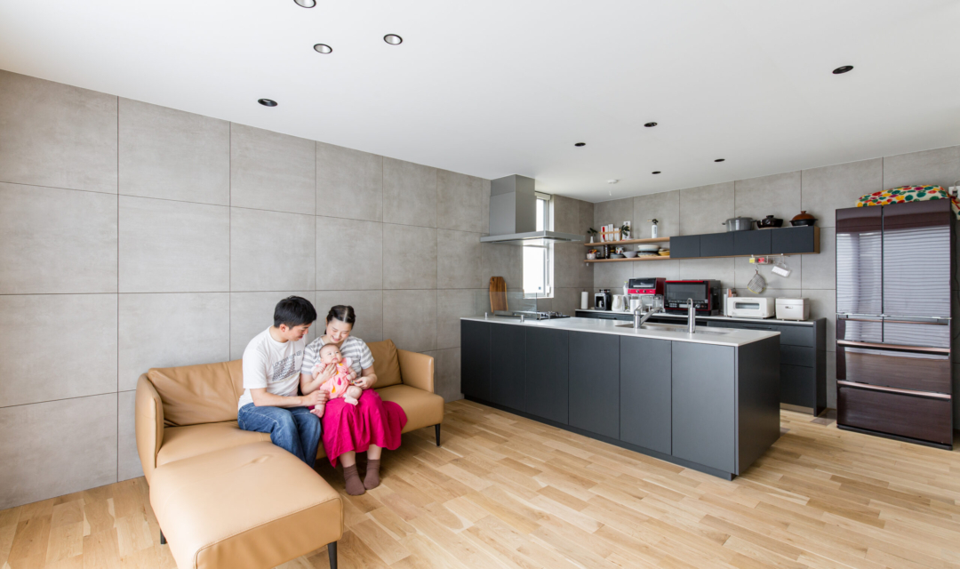 目を引く金属サイディングの外壁材に、壁面に貼られた大判のタイル、石塀に使われているガビオン、スタイリッシュなカーポート。全てが合わさり、たくさんあるガルバリウムのお家の中でも一際ガルバリウムの似合うかっこいいお家になりました。玄関に入ると正面の棚から間接照明の光が広がり、玄関部分にはデザイナーのペンダント照明、天井に貼られたレッドシダーが吹抜け空間を引き立てています。帰宅すると、玄関からフリースペースが見えるよう間取りを計画しています。F様邸ではフリースペースや趣味部屋、洗濯室、脱衣室など様々な用途のスペースも設けており、階段を軸に2方向に分かれた間取りなど、生活をラクに楽しめる工夫をしています。デザイン面でも洗面やトイレ、LDKにタイルのアクセントを設け、落ち着いた空間の中にも「かっこよさ」のある素敵なお家になりました。