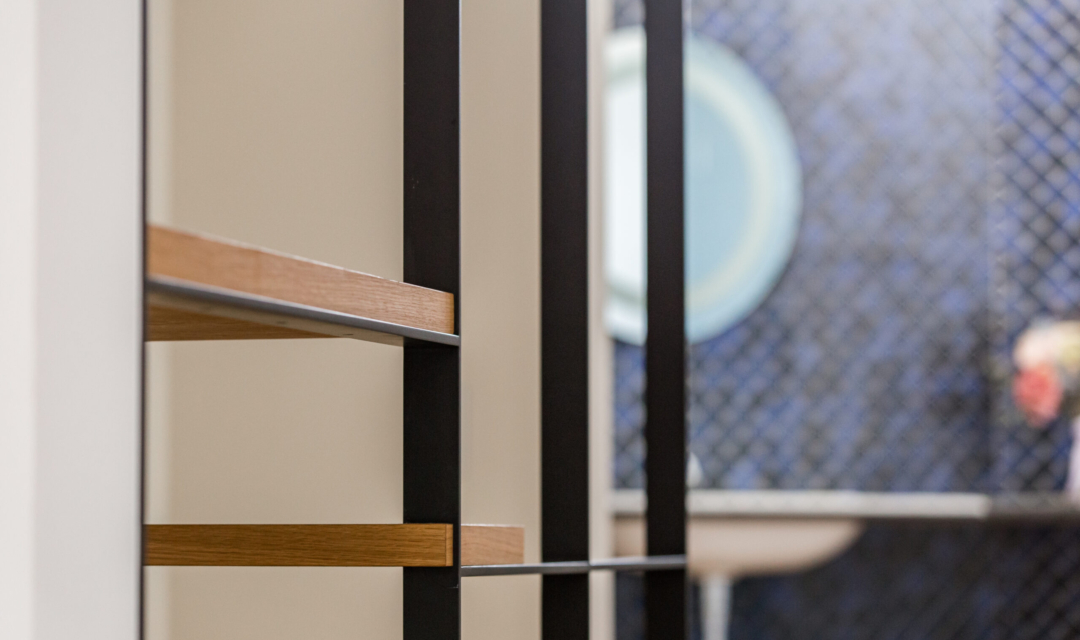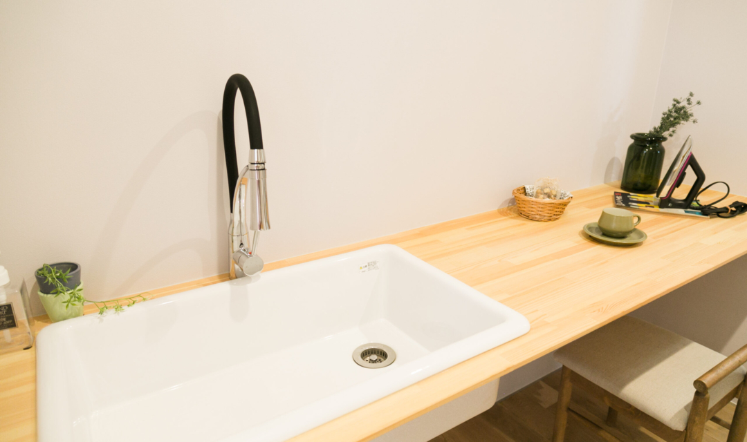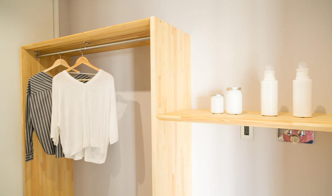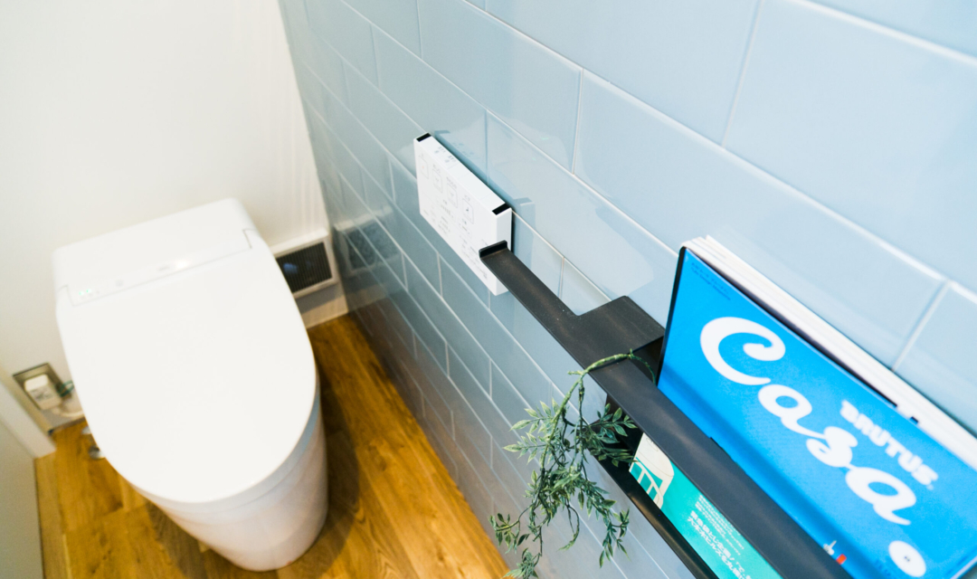 洗面には「コラベルタイル」を全面に貼り、印象的な洗面室に。棚はオープン棚を採用し、丸い鏡をつけることでおしゃれな洗面に。ハイサイドライトで明るく柔らかい陽の光が差し込みます。また、帰ってきてすぐ手を洗えるように玄関近くに配置。トイレや浴室にも近い場所に設け、ご家庭のカタチに合わせ使い勝手の良さにもこだわりました