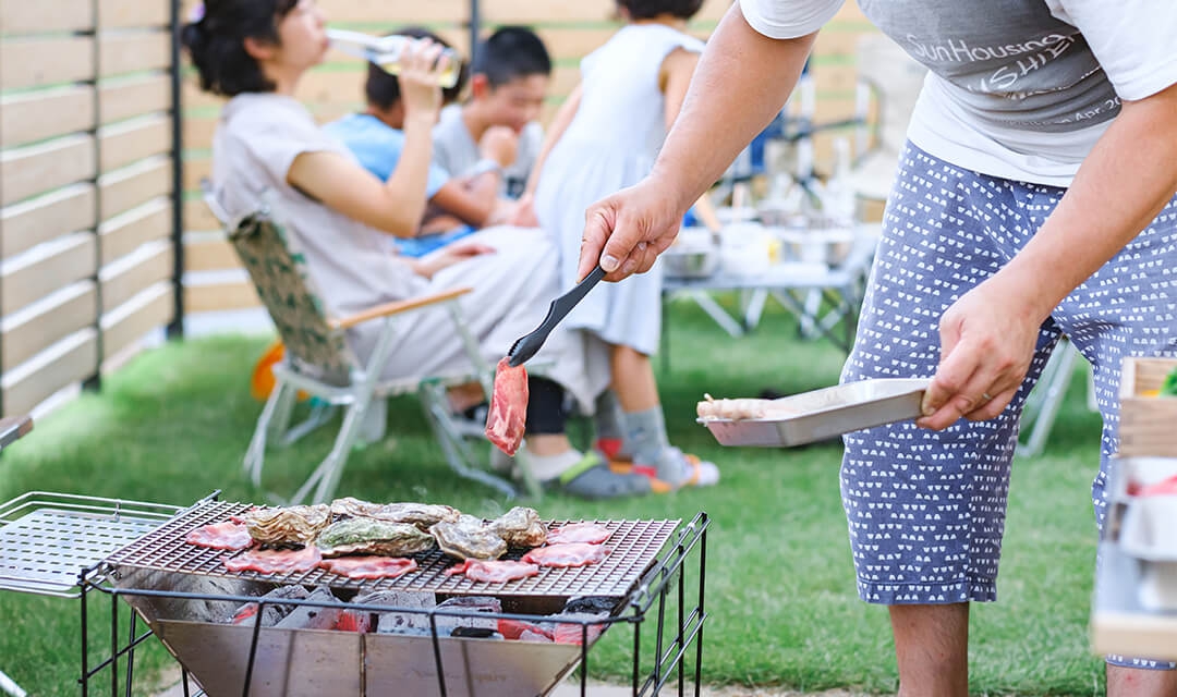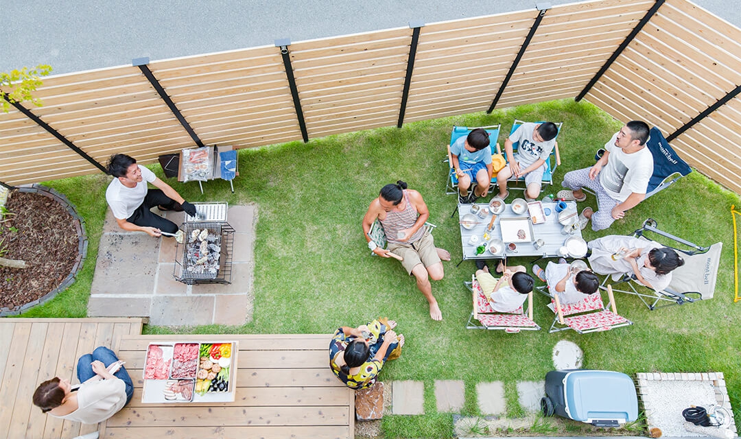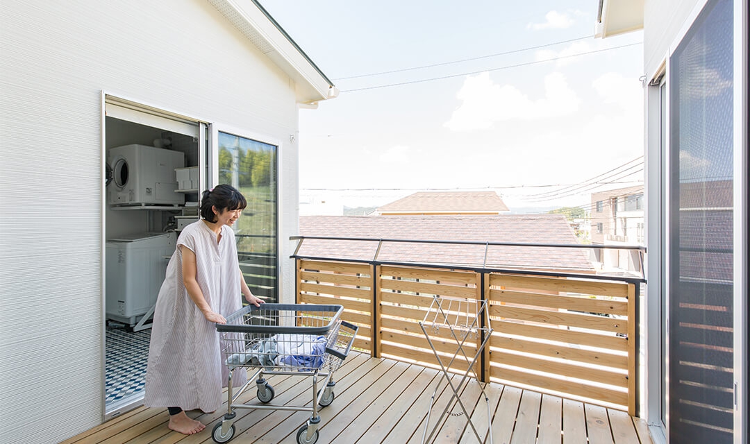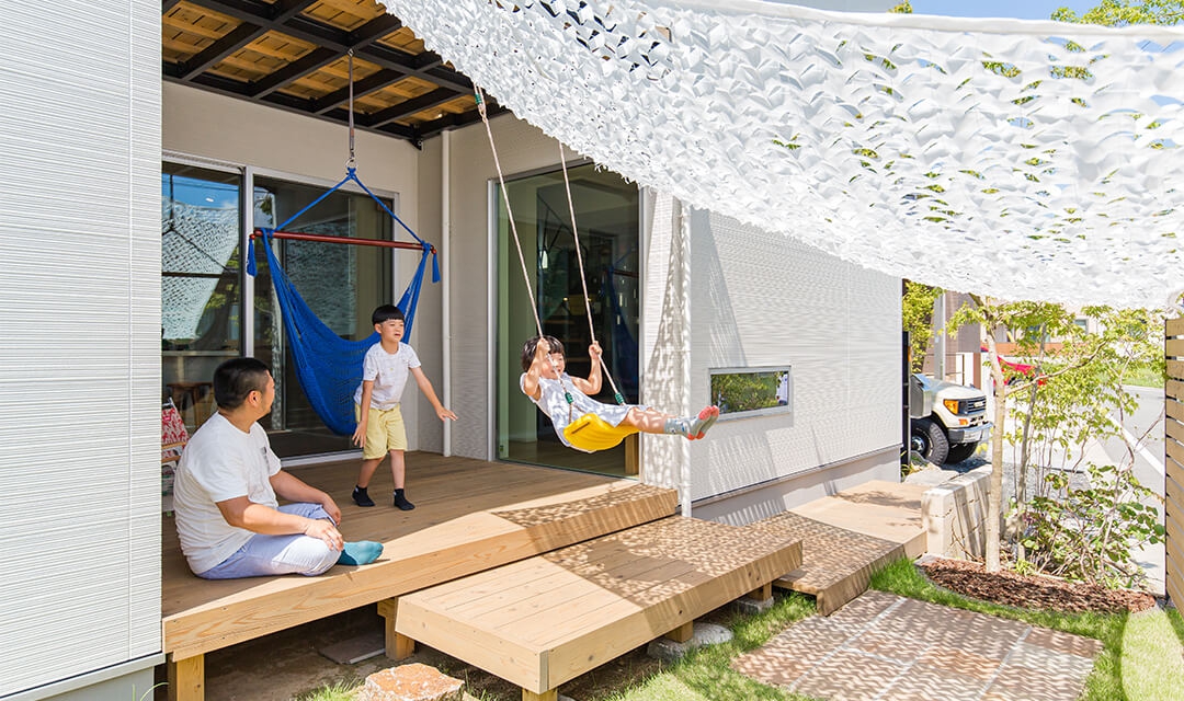 この家は、外部空間を囲む「こ」の字型プランになっています。1階・2階共にこの字で囲まれたテラスを設けているところが特徴的。夏の日差しを遮り心地いい空間を作り、ブランコやハンモックを設け、ワクワク楽しいテラス空間に。2F部分は大きな物干しスペースですが、お風呂上がりにちょっと夜風にあたって過ごすのも気持ちが良い空間に。 【1Fウッドテラス】 キッチン、リビングから気軽に出入り可能で、テラスデッキでBBQも楽しむことができるスペース。 【2Fウッドテラス】 各個室へと続く廊下は、ウッドテラスに隣接していて、2Fでも開放的な空間を実現しています。