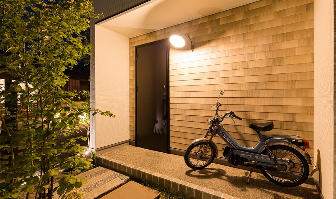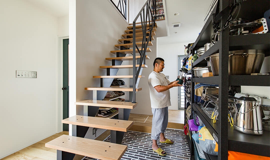 キャンプや釣り道具などアウトドアアイテムを多くお持ちのため、『駐車スペースからアクセスしやすい位置にかっこよく収納スペースを設けたい』とのご要望があり、収納エリアも兼ねそなえた土間スペースを計画しました。また、開放的な玄関空間をご希望されていたので、玄関入ってすぐ目の前にウッドテラスが広がるよう大きなFIX窓を配置しています。