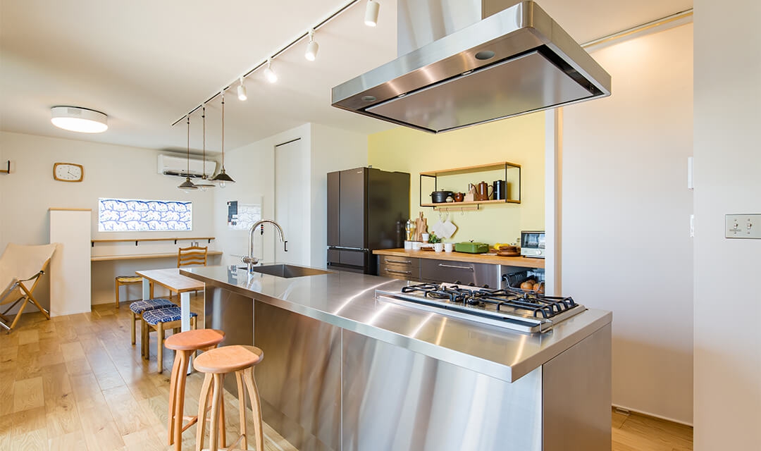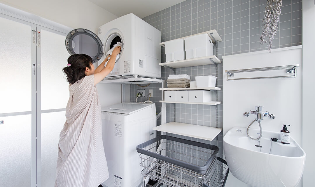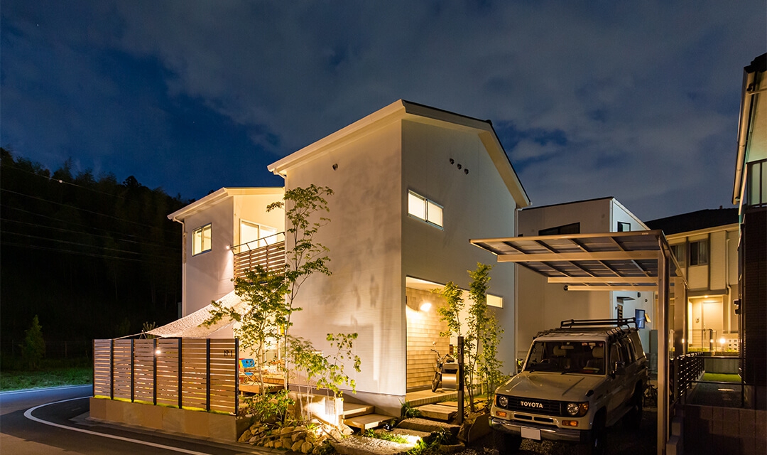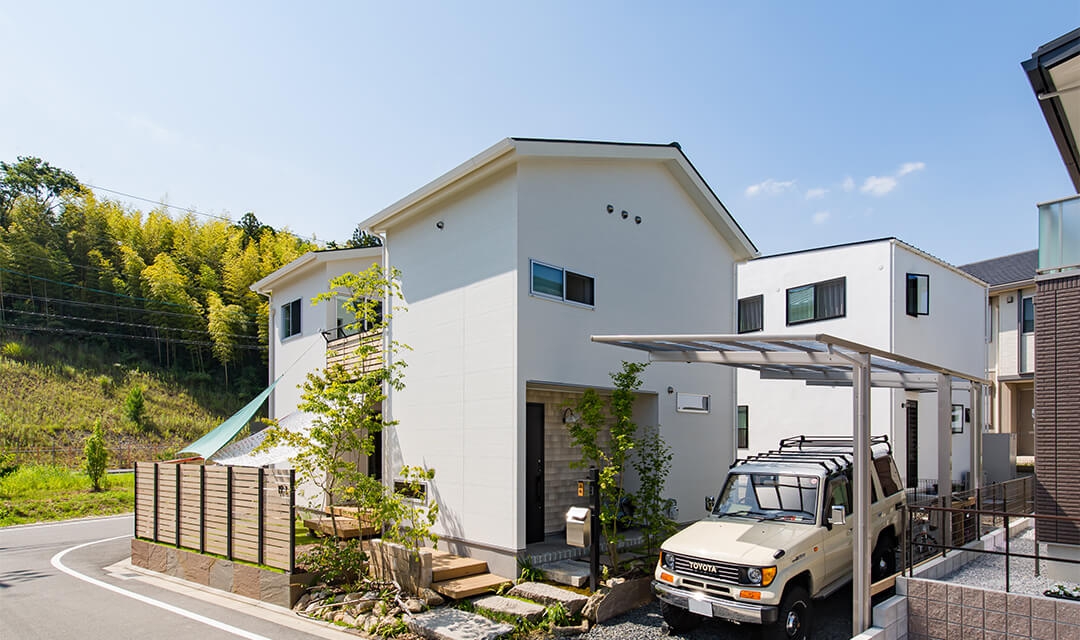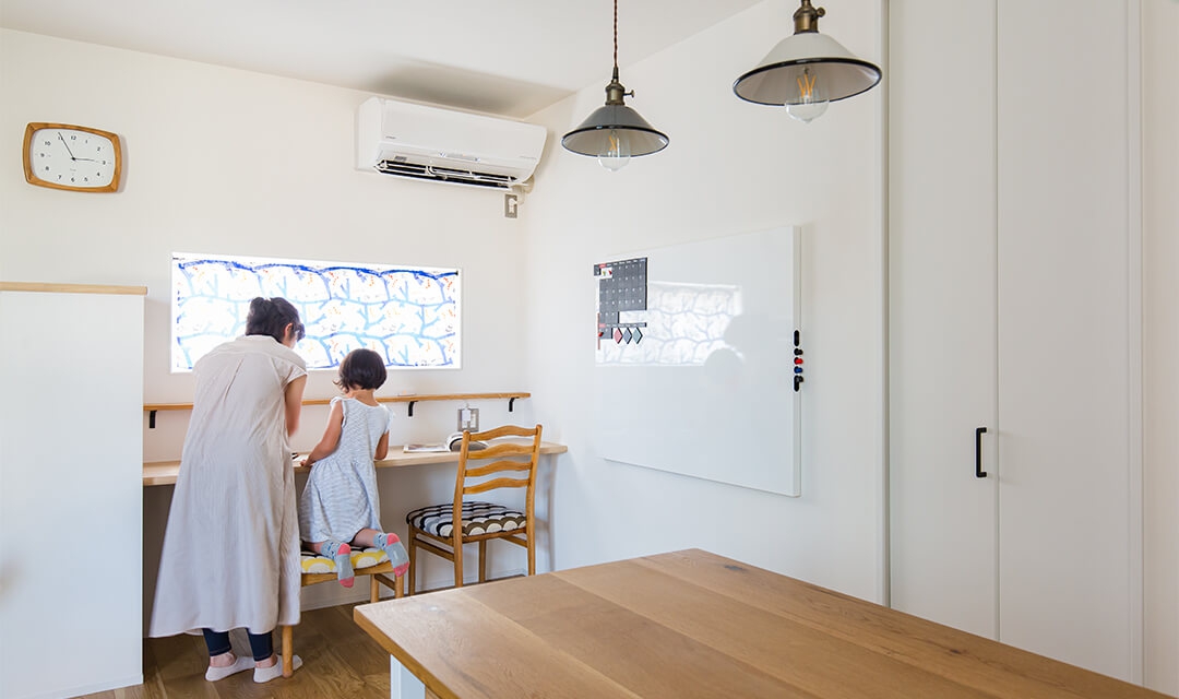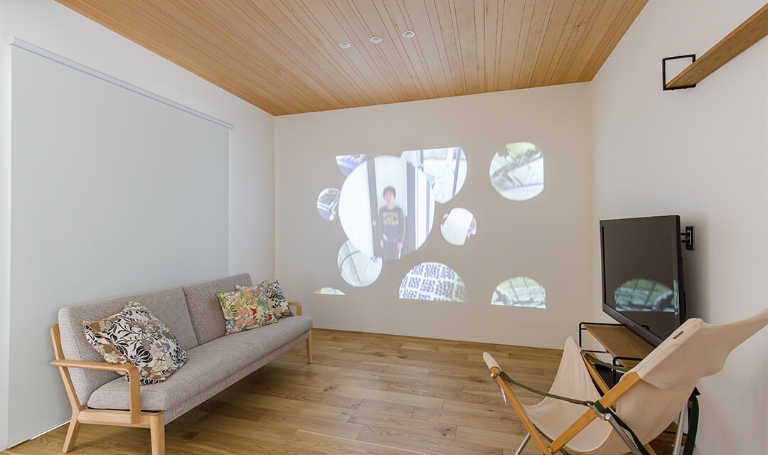 H様邸で家づくりのコンセプトメイクをすると、「明るく、風通しのよい家」「楽しい収納」「大きな物干しスペースと洗濯を楽に」「共働きで洗濯や食器洗いなど家事が楽になる家づくり」「気軽に人を呼べる家=庭と室内が一体化したような開放的な暮らし」「個室にこもらない、LDKに自然と家族が集まる家」というテーマができました。実際にできた家は、子供3人が部屋にこもらず家族で一つの場所でそれぞれの時間を過ごすことができる家に。2Fの子供部屋は将来2室に分けることができるように設計し、同じ2Fに洗濯を畳むスペースや家族みんなのファミリークローゼット用意。並びに洗面とランドリースペースを設けて、2Fのウッドテラスにそのままカートを使って物干しできるように楽家事設計をしました。1Fにはウッドテラスとだけでなく、家族で楽しめる工夫をたくさん施しています。シアタースペースやスタディエリアなど、家族が一緒にいられるための設計が活きた家になりました。