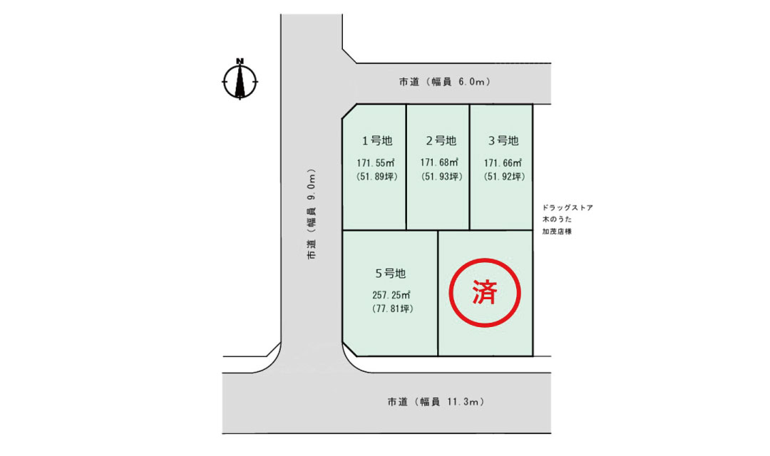 土地面積(区画面積) 171.55m2~257.25m2(51.89坪~77.81坪)(登記)