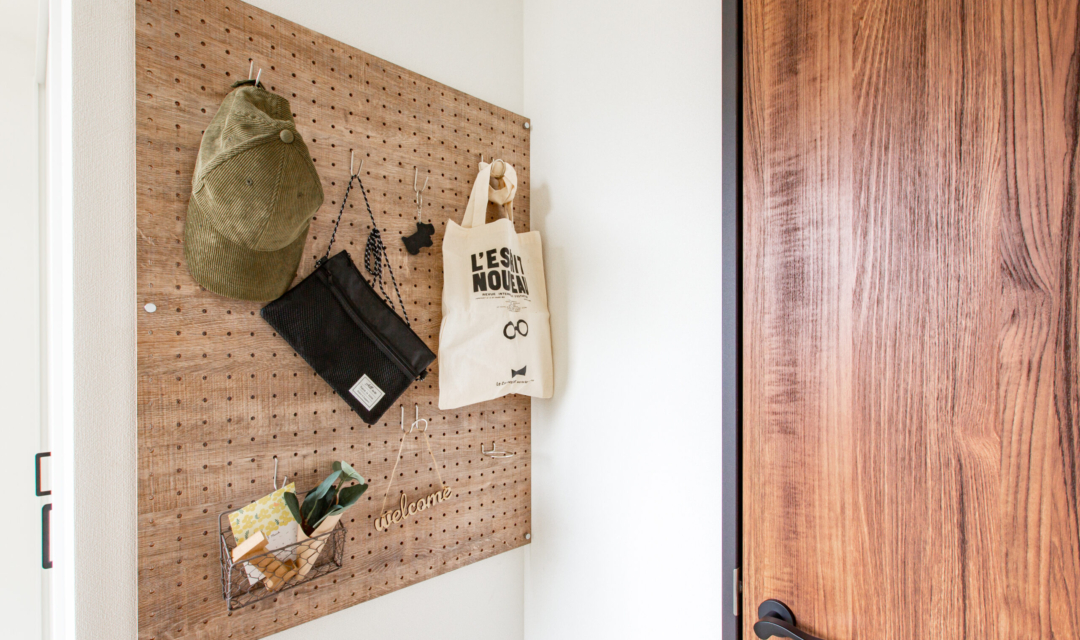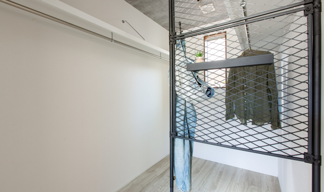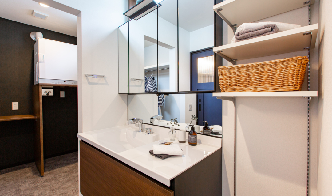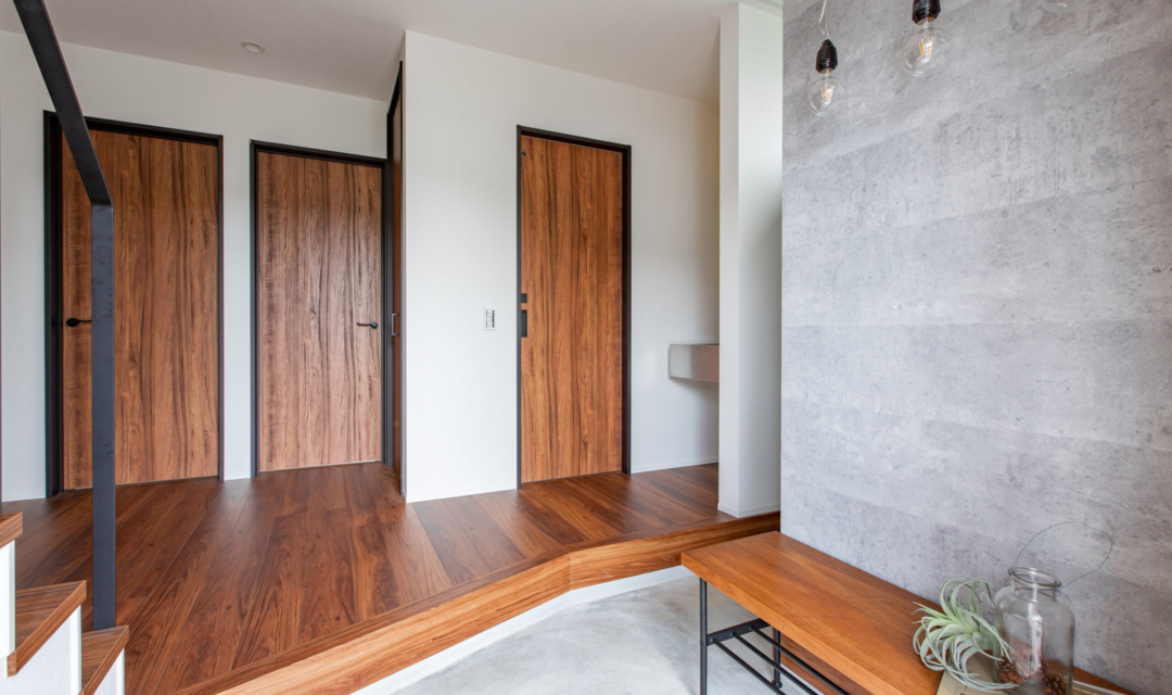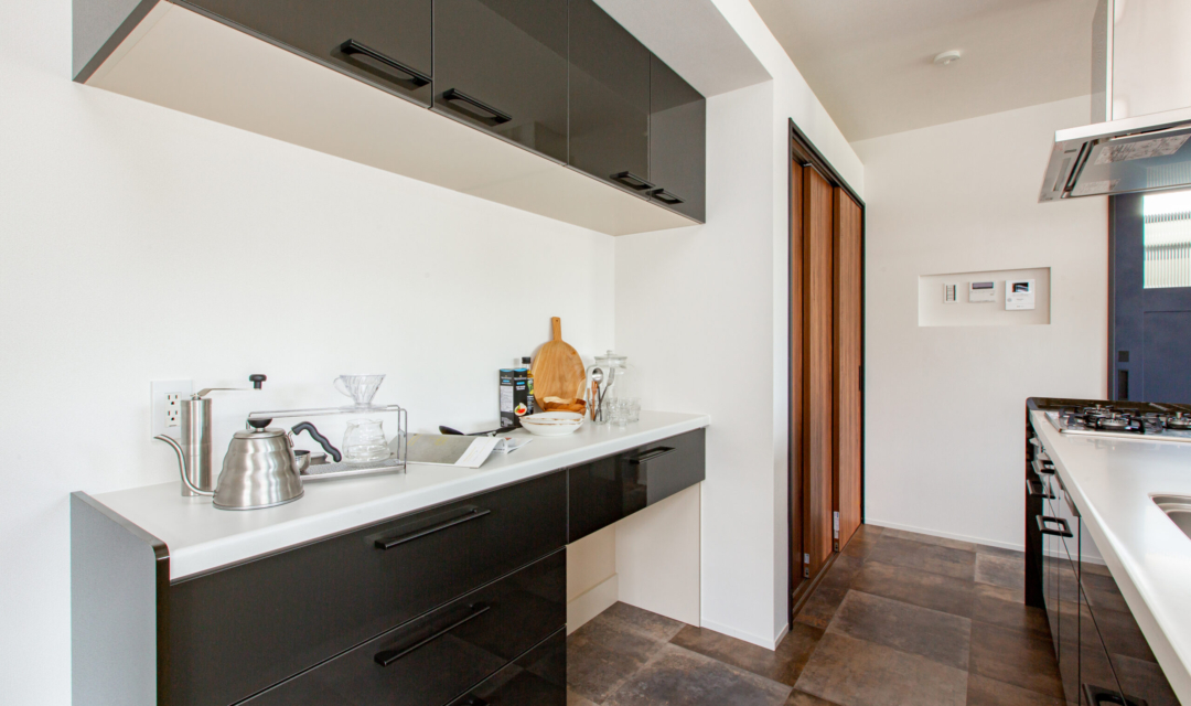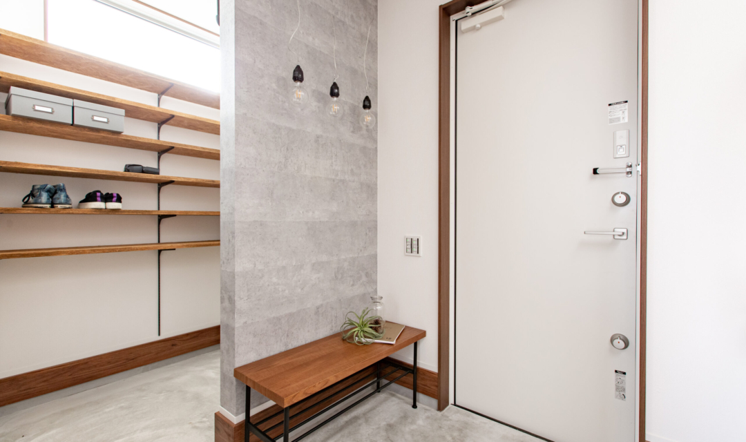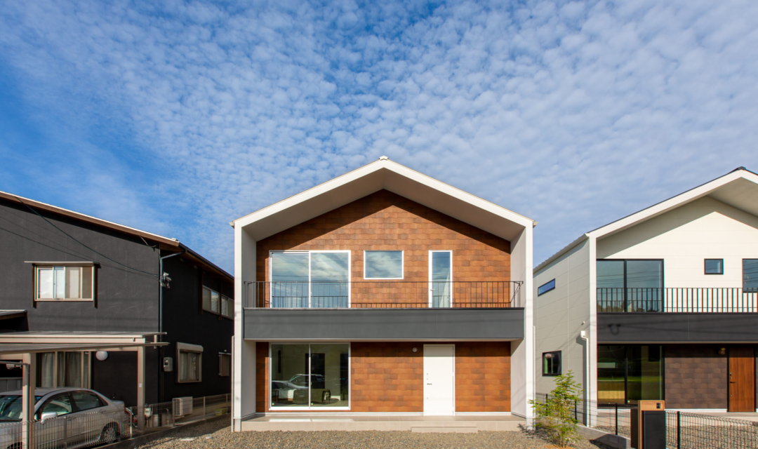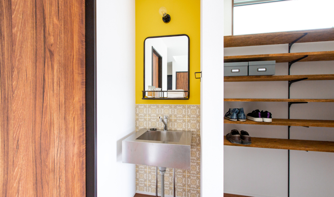 印象的な外観が特徴のこの家は、広々としたエントランスデッキにオレンジブラウンカラーの外壁、さらにアイアン手すりがかっこいい広々としたバルコニーで仕上げました。バルコニー下の空間では、椅子を置いて縁側のようにのんびりと過ごせます。また玄関には開放感のあるシューズクロークと玄関ベンチ、帰ってきたらすぐ手を洗えるミニ洗面を設けています。おしゃれさだけでなく実用性のある間取りにこだわりを。さらに、このお家の特徴は2階にリビングを設けていることです。周りの目線を気にせず過ごせる明るいリビングからの眺望は木津川市の自然を堪能できます。さらに、水廻りも2階に集約させているので家事も楽チンです。さらにさらに!お家の素材にもこだわりが見られ、アイアン・ステンレス・コンクリートタイル、荒削りの木材など、多種多様な素材を組み合わせることで生まれる、ギャップやユーモアのある空間に。