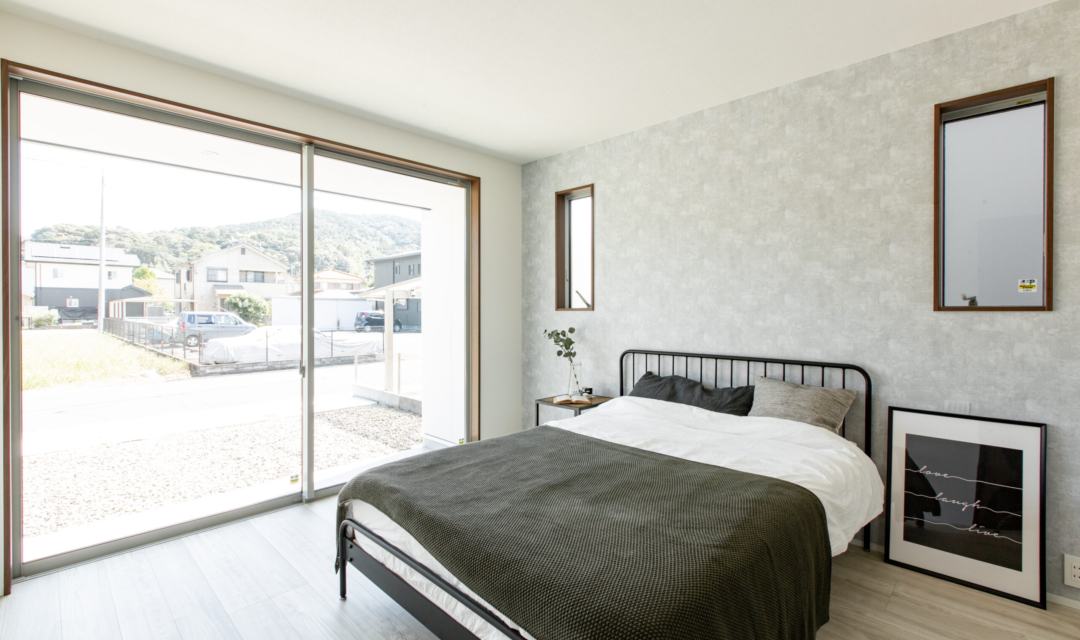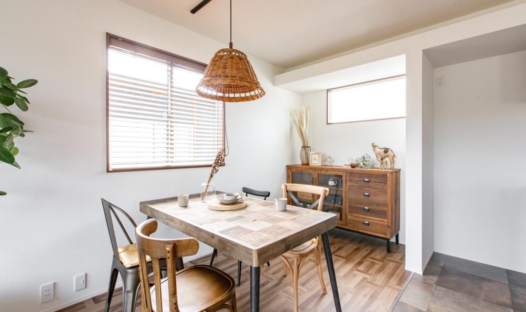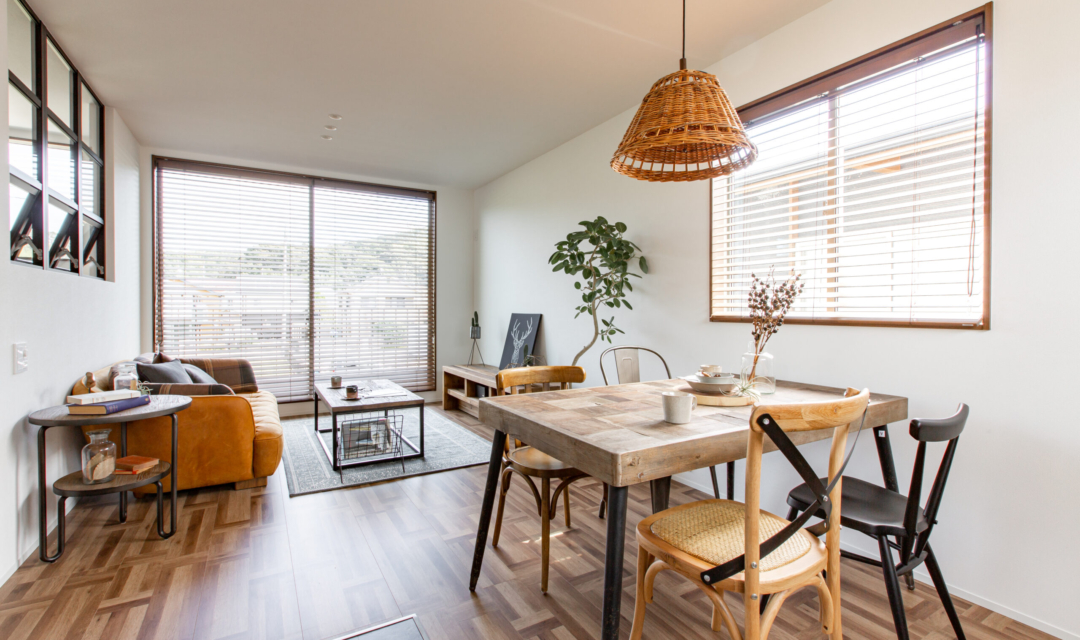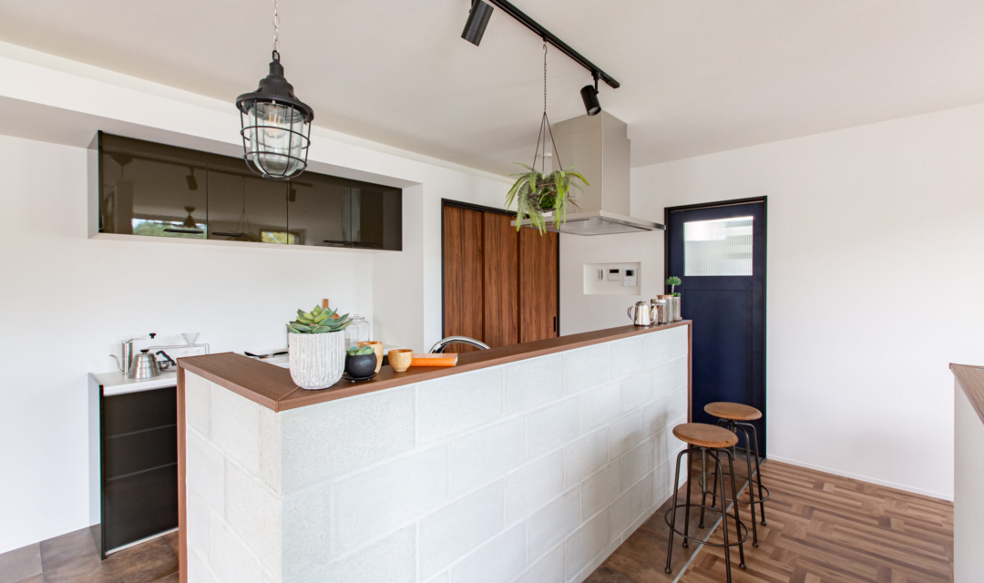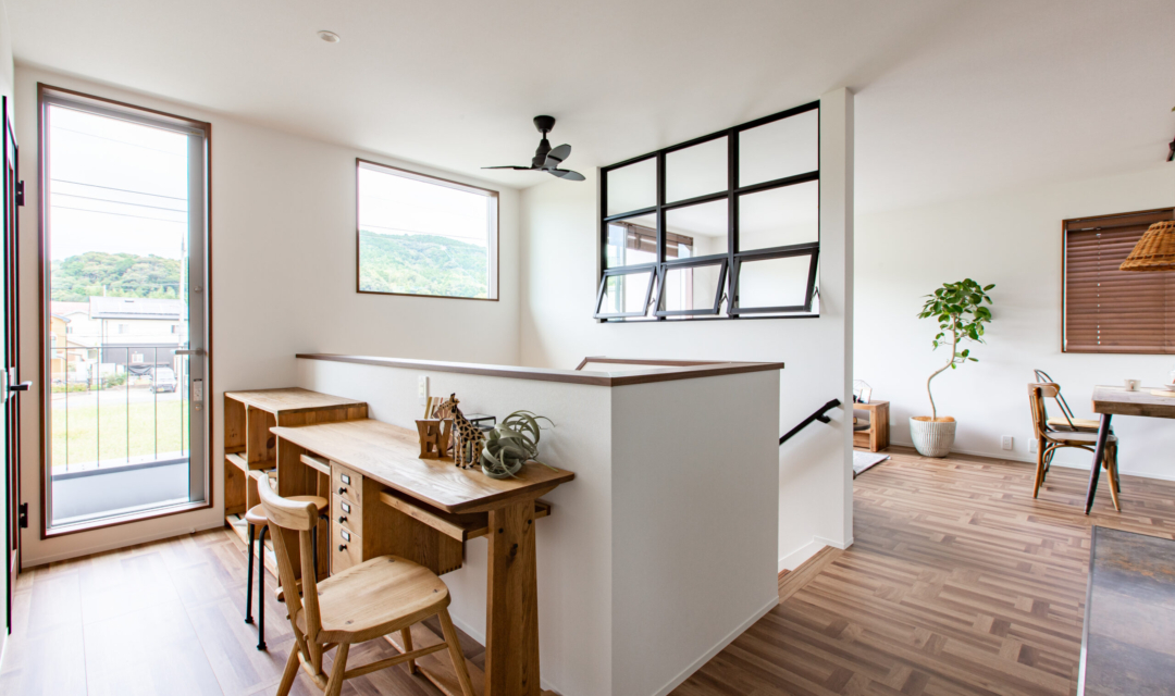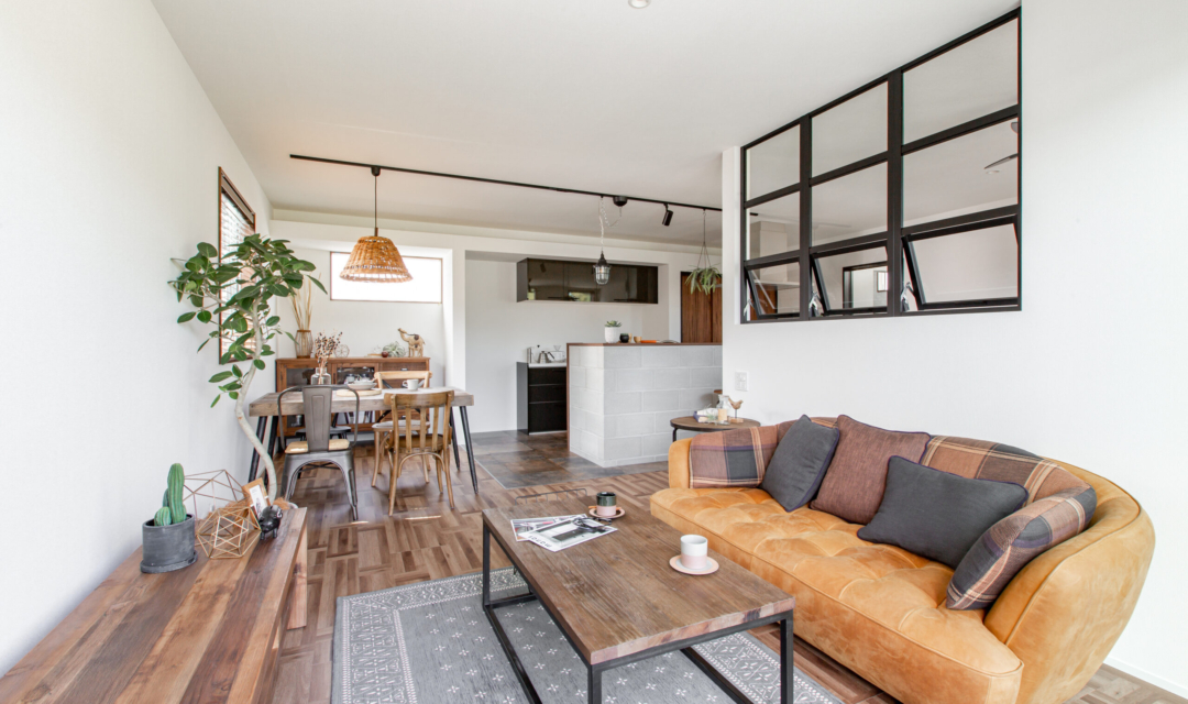 2階リビングとすることで近隣の目を気にせず、プライバシーを保った中で生活をすることができます。吹き抜けになっている階段空間にもおしゃれなアクセントのアイアン窓、さらに開口の大きな窓を設けることにより室内を明るい空間に。この明るいリビング(シャッターを閉めずに生活できる)が2階リビングの最大の特徴ですね。そしてキッチンには、コンクリート調タイルをアクセントにチョイス!覗き遊び心のあるインダストリアル空間が広がります。キッチン周りの床には、フロアタイルを採用し空間のメリハリをつけました。