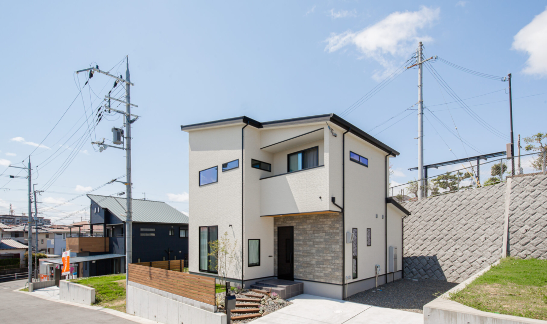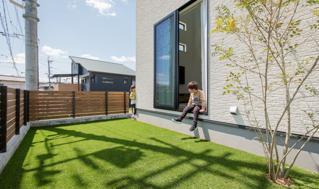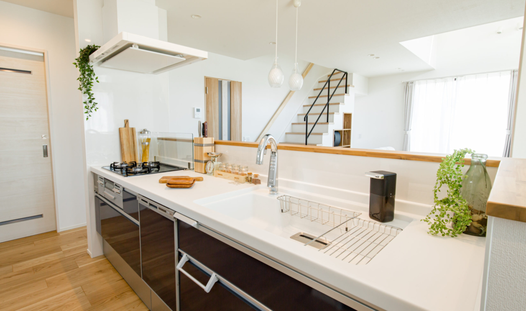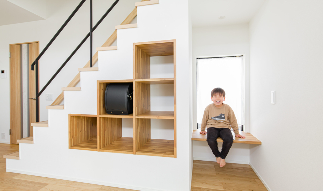 玄関からつながる洗面室&ランドリールーム・キッチンへの回誘導線がこの家のポイントです。中でも、玄関からの動線上に設けた2畳の大容量のシューズクロークは玄関の散らかりを解消してくれます。さらに、帰ってきてすぐ手を洗えるように洗面室へのアクセスが良いのは子育てママには嬉しいポイントですね。そして、LDKには2つの収納を設け、お部屋がスッキリ見せる工夫もしています。階段下のデッドスペースを収納にしてみたり、ベンチを設けていてカウンターとしても使うこともできちゃう自由度の高い空間になっています。キッチンに横にはホワイトボードニッチを設置しているのでお子さんの学校でのプリント類が散らかることもなく、すっきりとした清潔感のある空間に仕上げています。