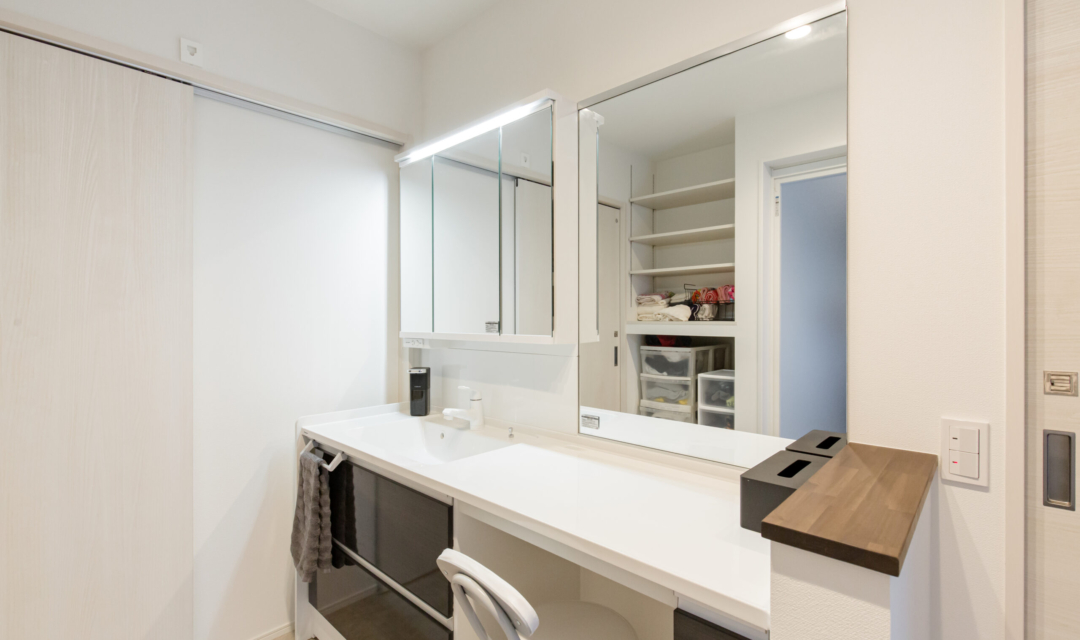 洗面室&ランドリールームは、4畳もある広々とした空間になっています。洗面台は、朝の時間に混雑しないように洗面ボウルとカウンター部分に分かれています。カウンター部分は、お子様の髪を結ったりなどもしやすい余裕あるお化粧スペーだから朝の用意もスムーズに。また洗濯物を畳めるスペースとしても使うことができます。全体的にホワイトカラーでまとめているので清潔感があり、明るい洗面&ランドリールームになっています。