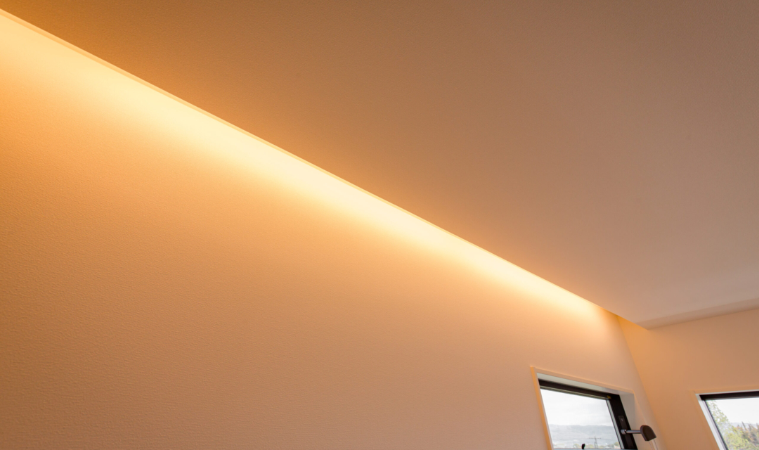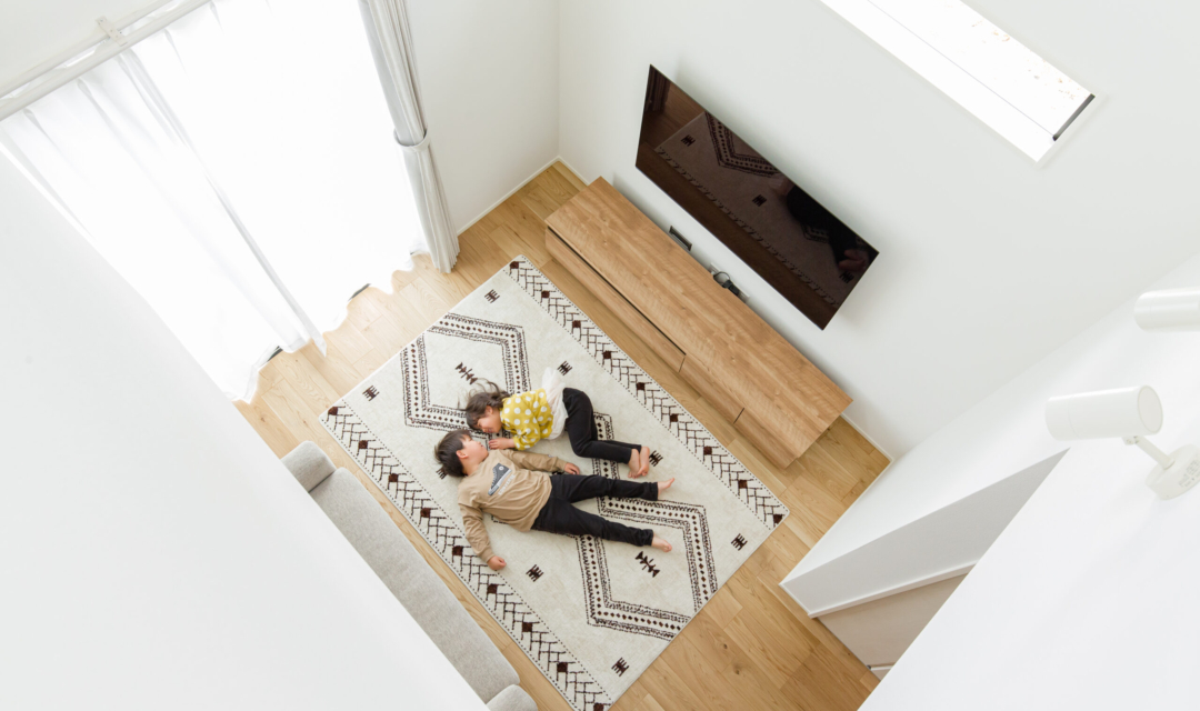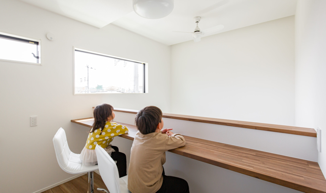 リビングには大きな吹抜けを設けていて、明るい部屋を演出しています。さらに、天井に設置したファンが冷暖房を効率良く広げてくれる役割まで。そしてこの吹き抜けの特徴は2階に設けたカウンターです。プロジェクターを設置して、カウンターに座りながら映画鑑賞ができるホームシアターに早変わり。リビングだけでなく、家の色々な場所に家族の憩いの場所がある家に仕上がりました。