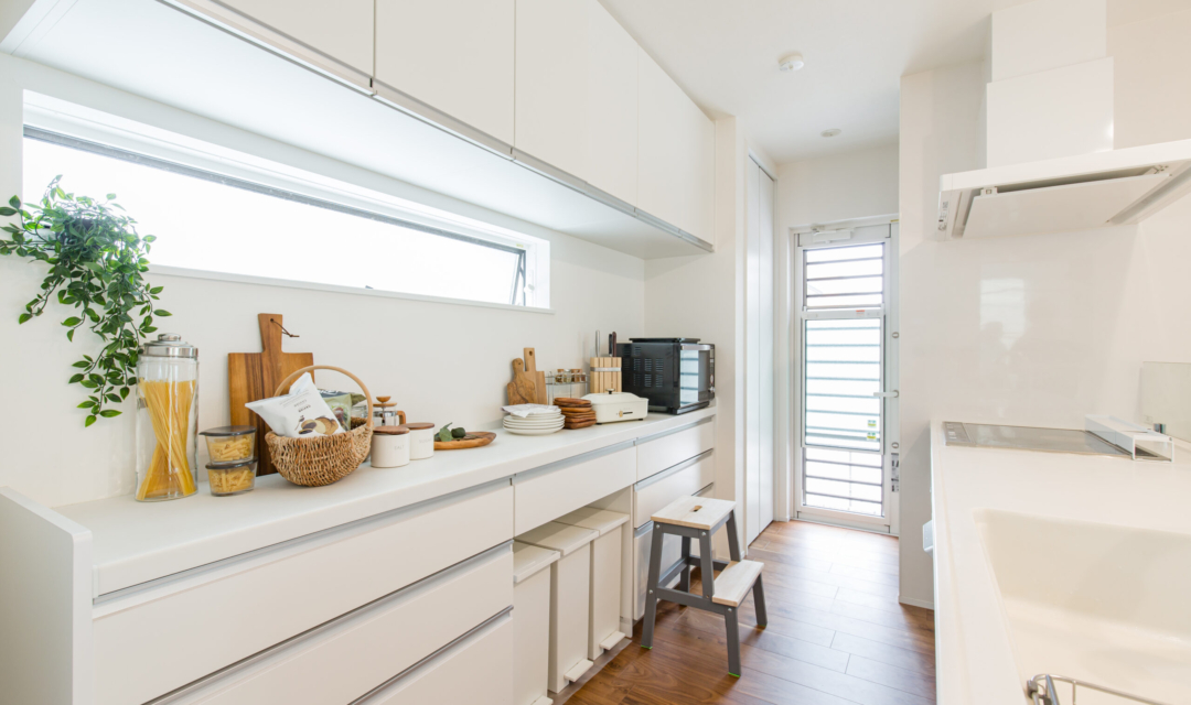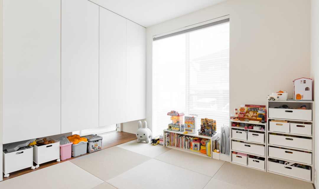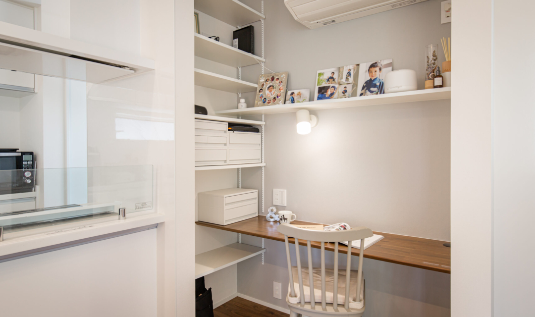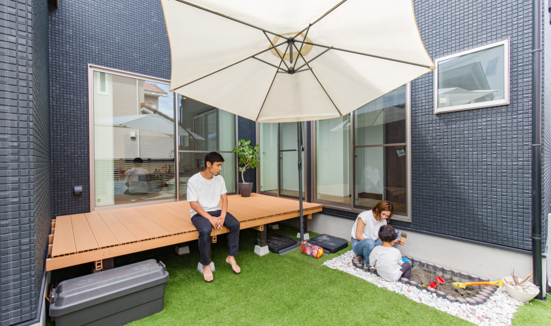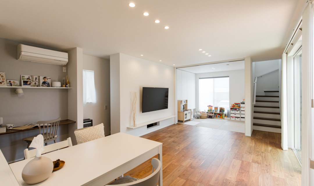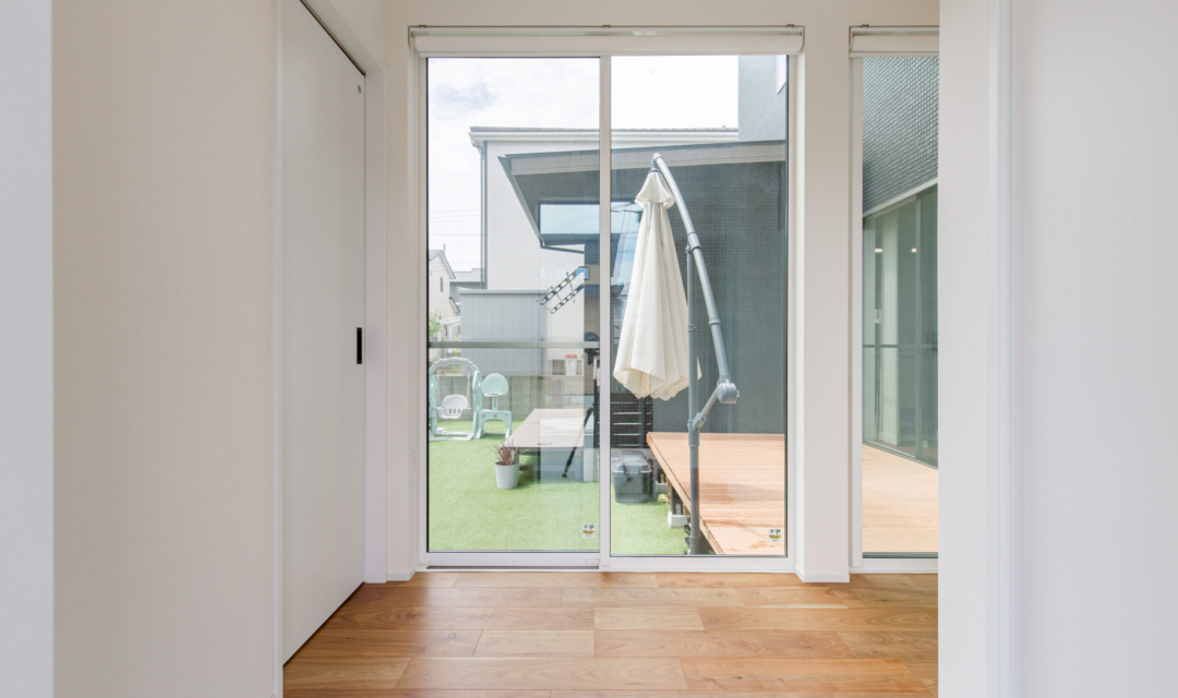 このお家のもう一つの特徴は、一直線に並べられた間取りです。キッチン、ダイニング、リビング、和室を一直線に並べることにより、どこに立っていても周りを見渡すことができ、リビングが畳数よりも広く感じられる工夫が施されています。さらに、ダイニングにはスタディスペース、リビング横にはお庭へ直接出入りすることができる大きな掃き出し窓を設けているのでウッドデッキへのアクセスもGOOD!お庭も道路からは見えない位置に設計しているので子供を安心して遊ばすことができるようになっています。