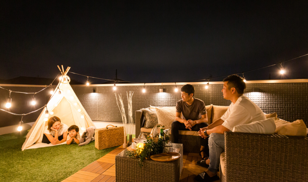 屋上リビングでは、お庭やインナーバルコニーとはまた違った空間が広がっています。 完全プライベート空間となるのでお休みの日にはバーベキューを楽しめたり、壁面にプロジェクターを写すと野外のホームシアターになります。家族団らんや趣味の時間を思う存分味わえる屋上リビングです。