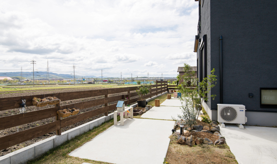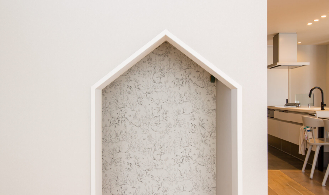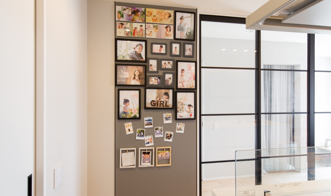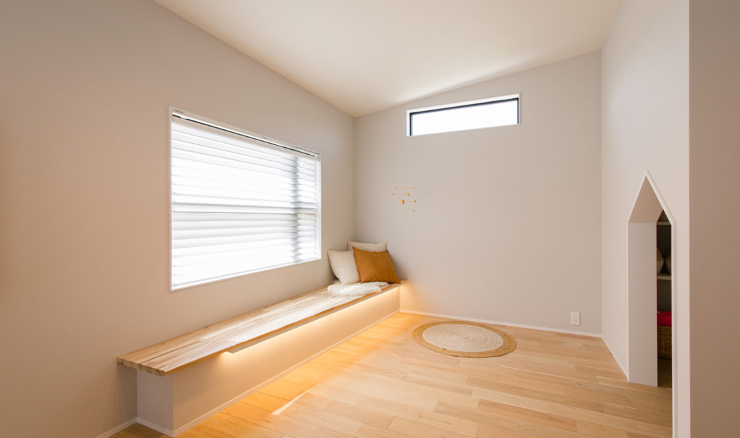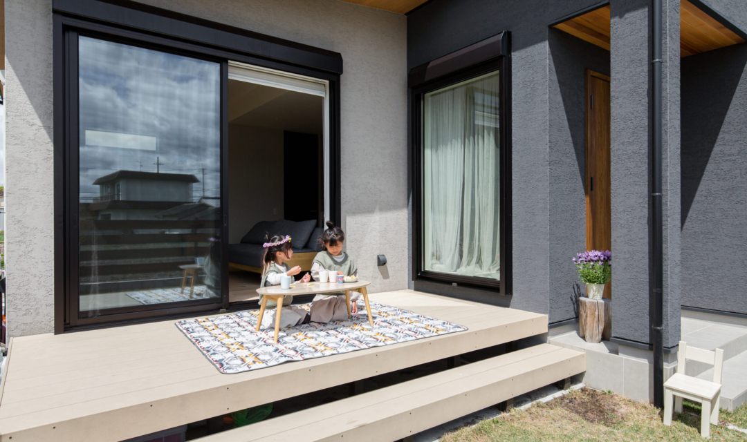 玄関を入ると、大きなピクチャーウインドウ+ベンチを設けていて、玄関が明るく広々と感じるように工夫しています。 荷物をおいたり、靴を履いたり、インテリアを飾るスペースなどマルチに活用していただいてます。 キッチンからリビング・ダイニング全体を見渡せ、二世帯住宅でも広々と過ごせるような空間を作っています。 リビングには大きな窓を設けてウッドデッキとつながるように計画しました。 また、リビング横にはプラスαエリアとしてお子様が遊んだり、インテリアを楽しめるようにベンチをご提案。 田んぼの緑豊かな景色が屋内からも広がるように、また木津川市の花火大会も見られるようにバルコニーを設けています。