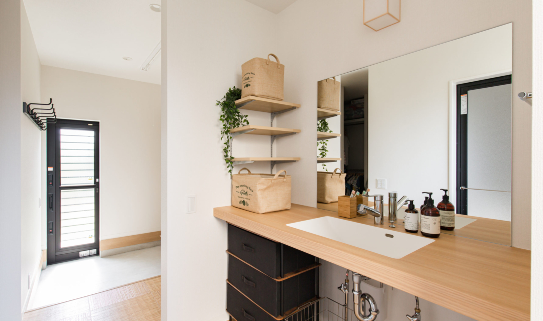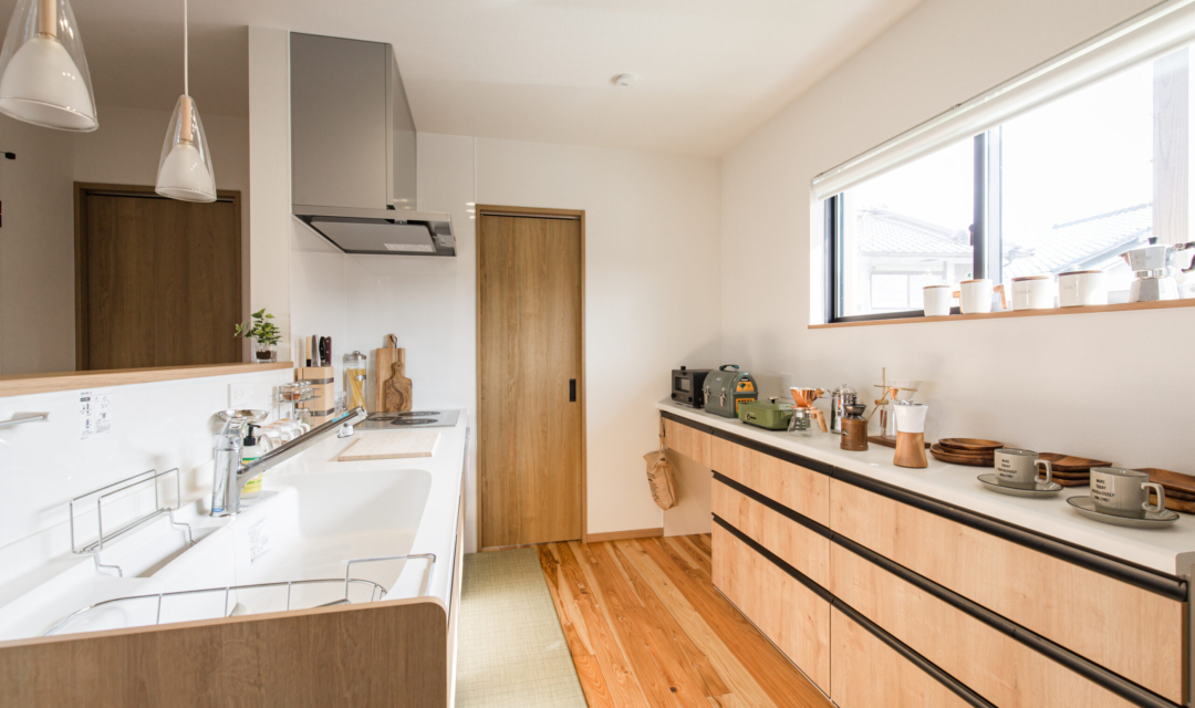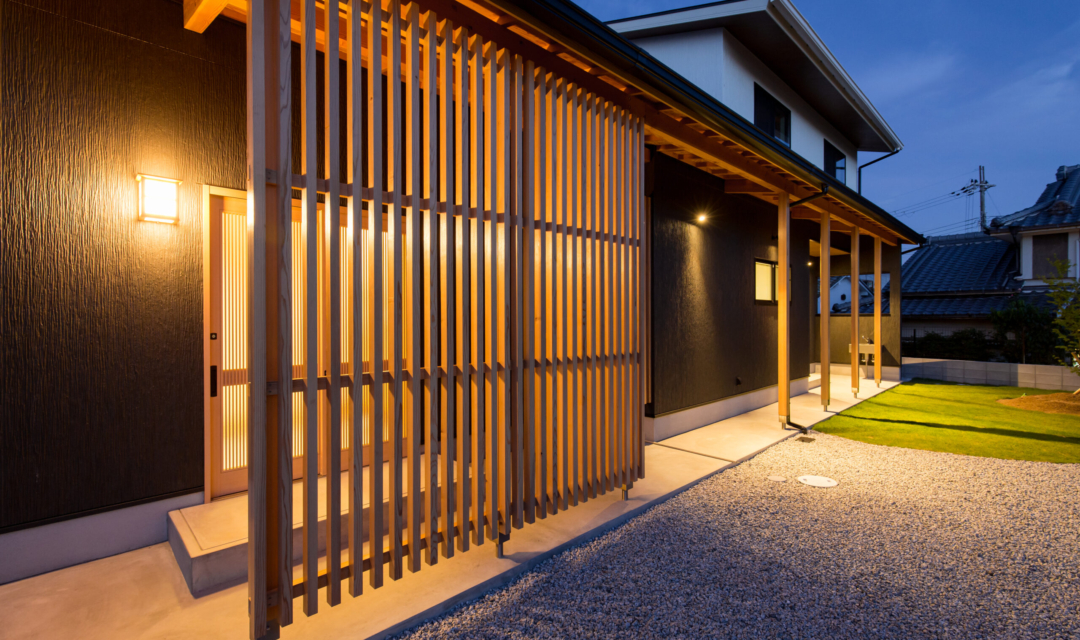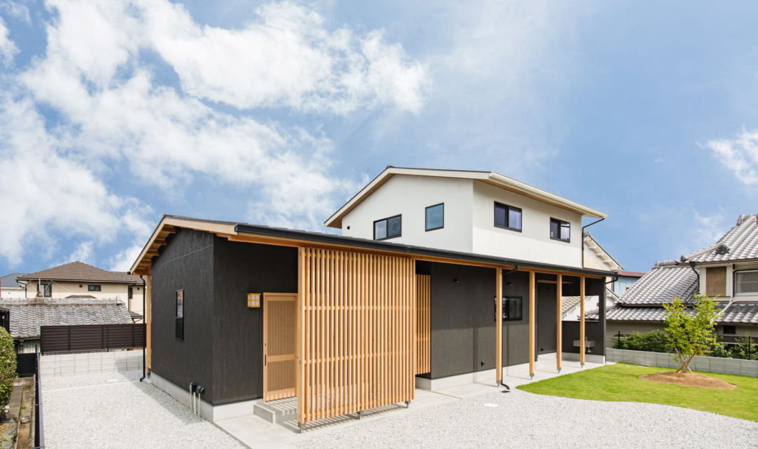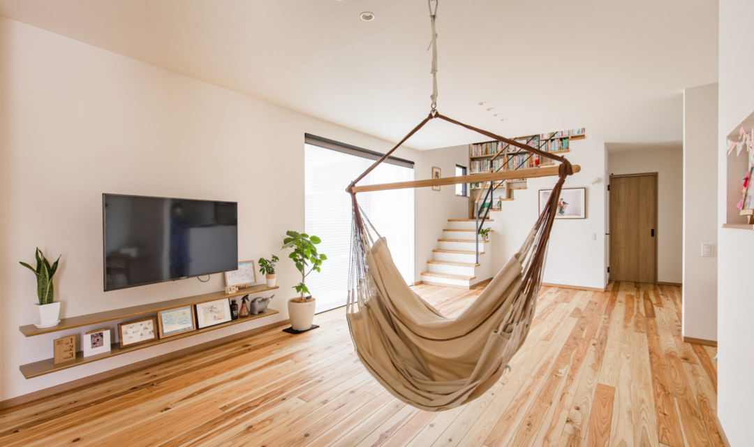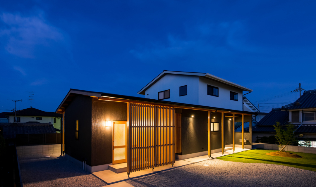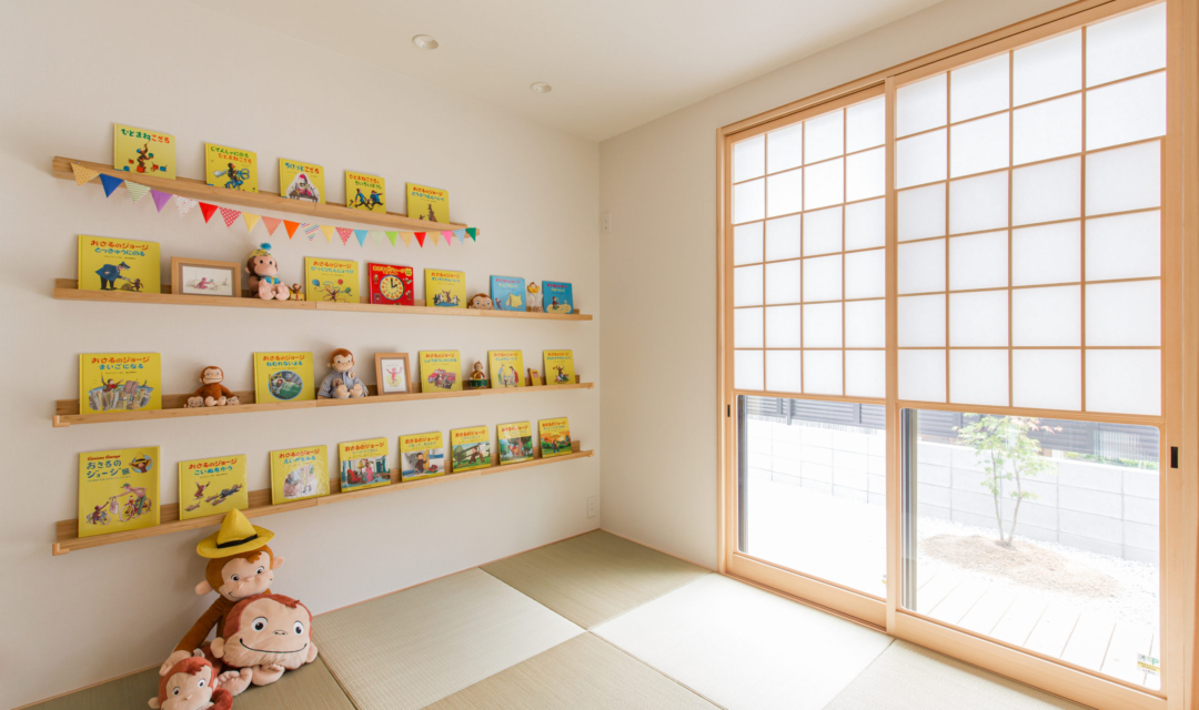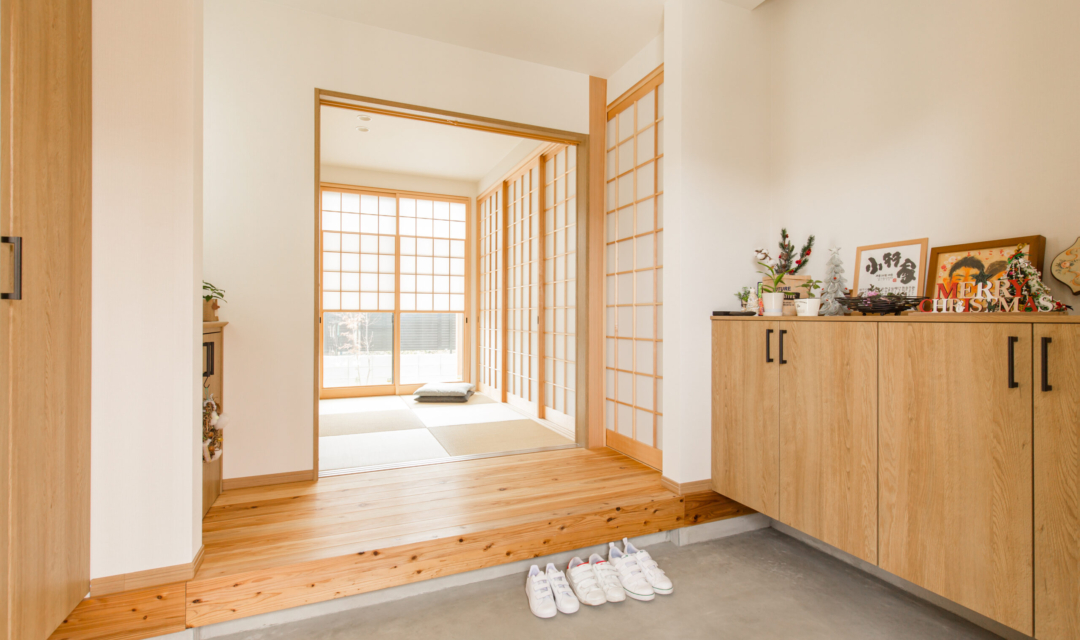 K様邸でのお家づくりは「平屋のようなお家」「和風の外観」「ウッドデッキ」「効率が良い」「家族が自然と集まる家」をテーマに設計し、どこにいてもお子様の存在が感じるられ、見守ることができる間取りに。勝手口を利用した「ご主人様動線」には「洗濯動線」を集約し効率よく、家事が楽になる工夫をしています。またお庭には、紅葉を植えており和室の雪見障子から眺めたり、季節を感じることが出来ます。木の温もりに溢れたコーディネートや家族の思い出を飾れる飾り棚に、五月人形を飾ってその下の棚にすっぽり収納できる場所や玄関も収納が十分にできるように広くとっています。家族の趣味の家庭菜園のスペースや、のびのびと暮らせる工夫もしています。リビングにはハンモックを取り付けたり、冬場はこたつを出したり変化を楽しめ、手を伸ばせばすぐどこかにコミュニケーションツールがある。そんな家族の時間や思いを共有できるお家になりました。