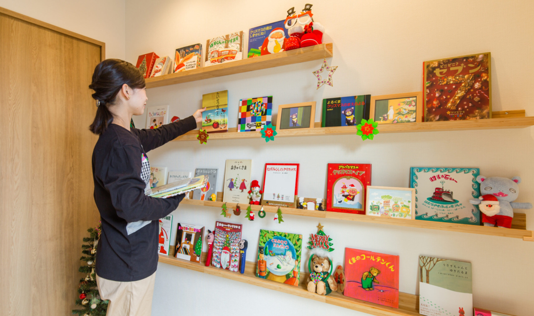 図書館のようなオープン本棚。「本を飾って収納したい!」とのご要望で造作の本棚をメイン動線上にアクセントとして設けました。お子様も自然と本を手にとる習慣ができるので、生活の一部として、また親子のコミュニケーションも取れるホームライブラリー空間です。またオープン階段になっているので和室まで見渡すことができ、開放感がある空間になっています。
